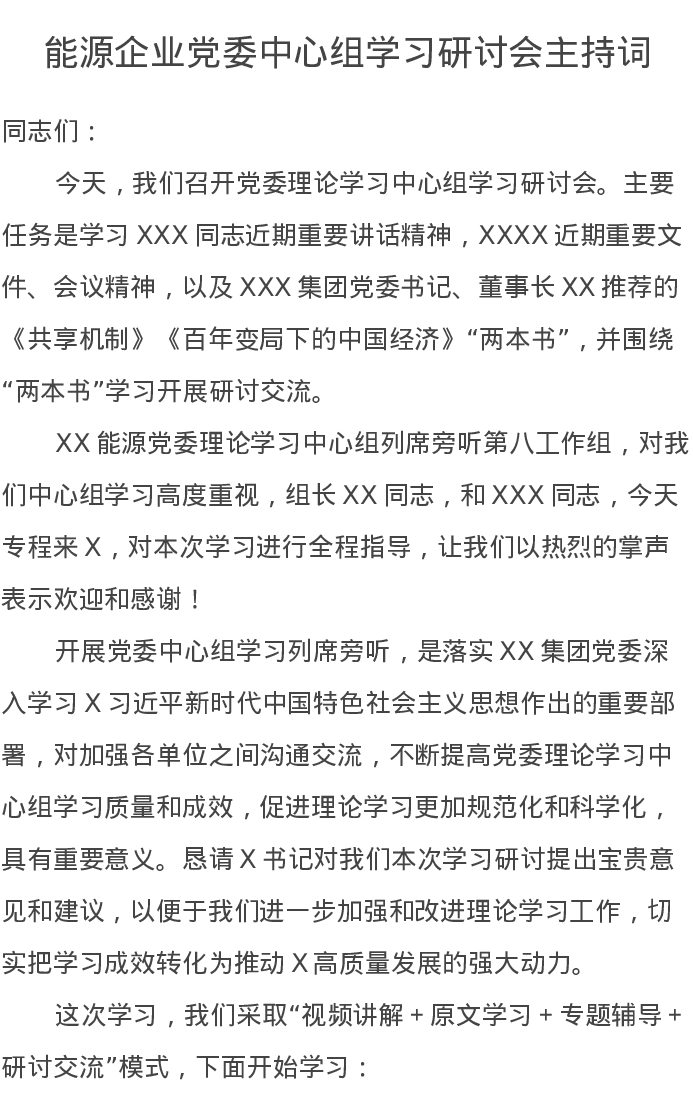 能源企业党委中心组学习研讨会主持词