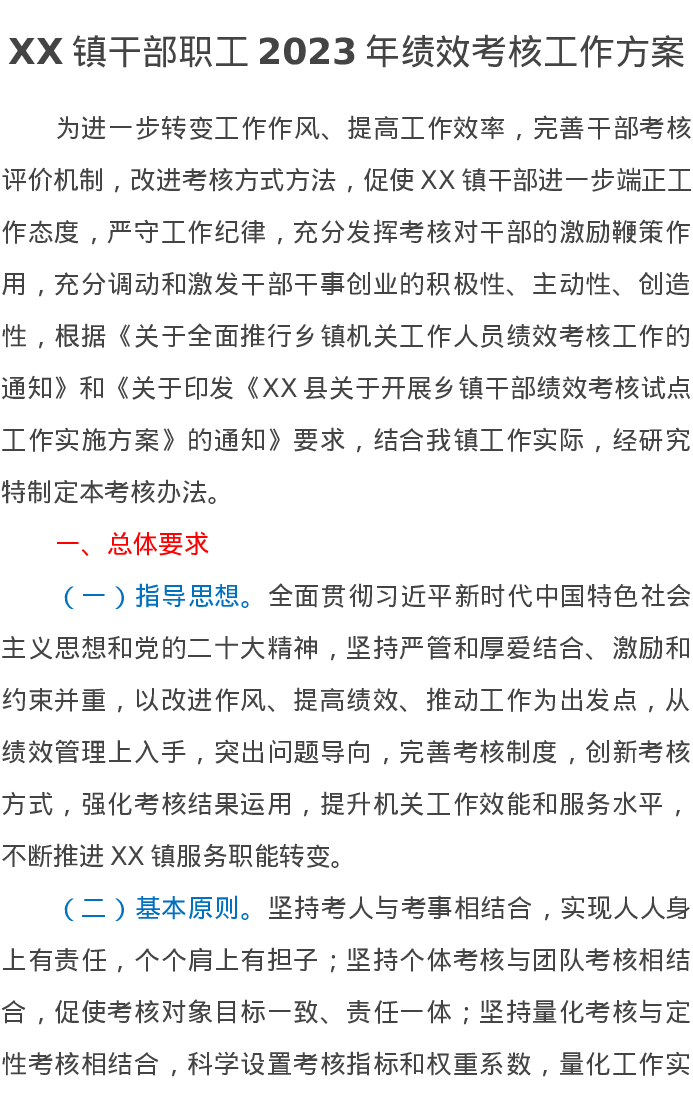 XX镇干部职工2023年绩效考核工作方案