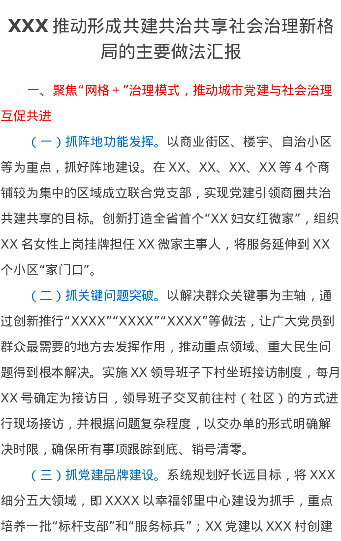XXX推动形成共建共治共享社会治理新格局的主要做法汇报