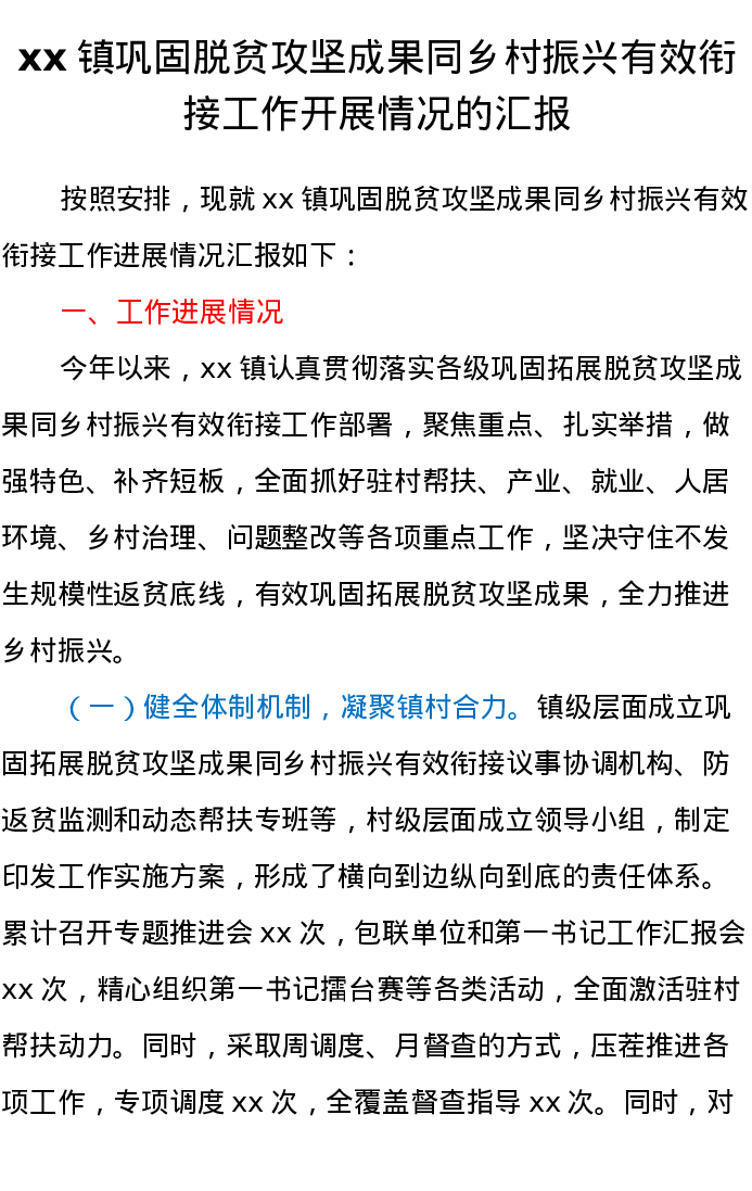 xx镇巩固脱贫攻坚成果同乡村振兴有效衔接工作开展情况的汇报