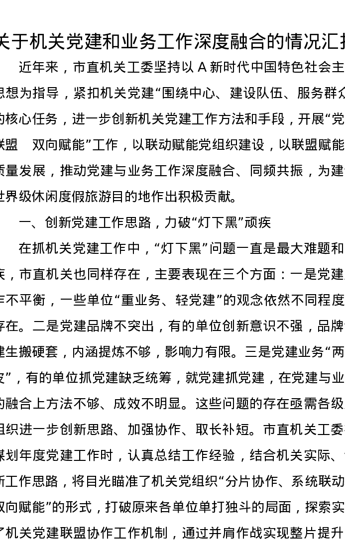 关于机关党建和业务工作深度融合的情况汇报