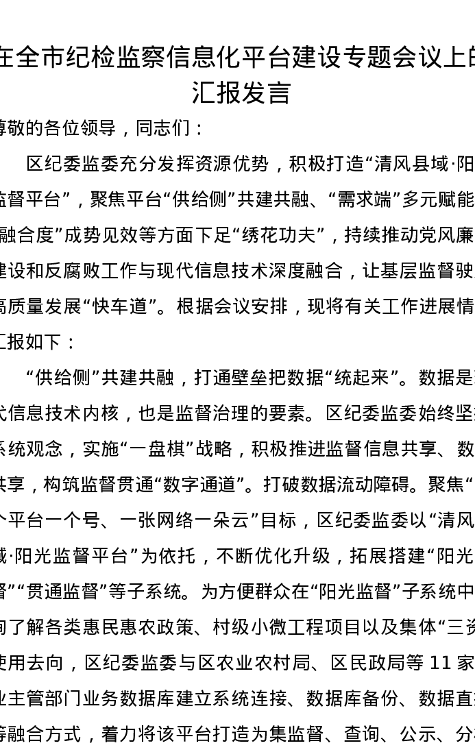 在全市纪检监察信息化平台建设专题会议上的汇报发言