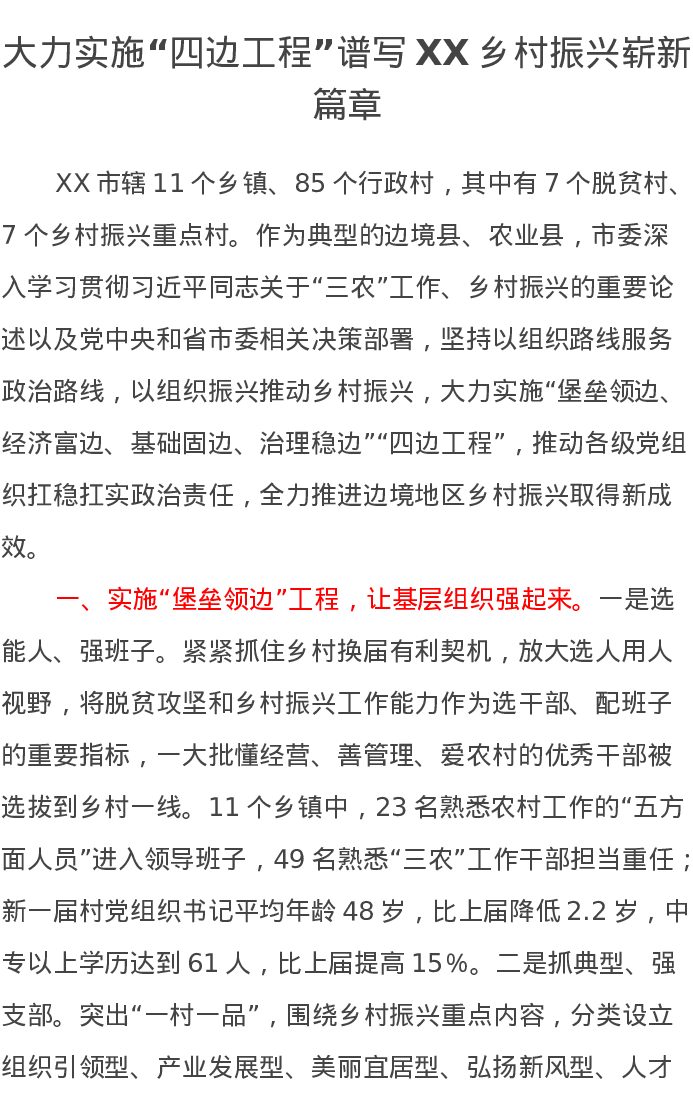 工作汇报:大力实施“四边工程”谱写XX乡村振兴崭新篇章