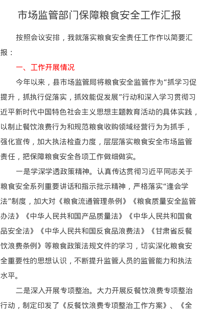 市场监管部门保障粮食安全工作汇报