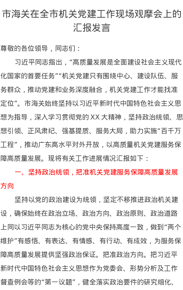 市海关在全市机关党建工作现场观摩会上的汇报发言