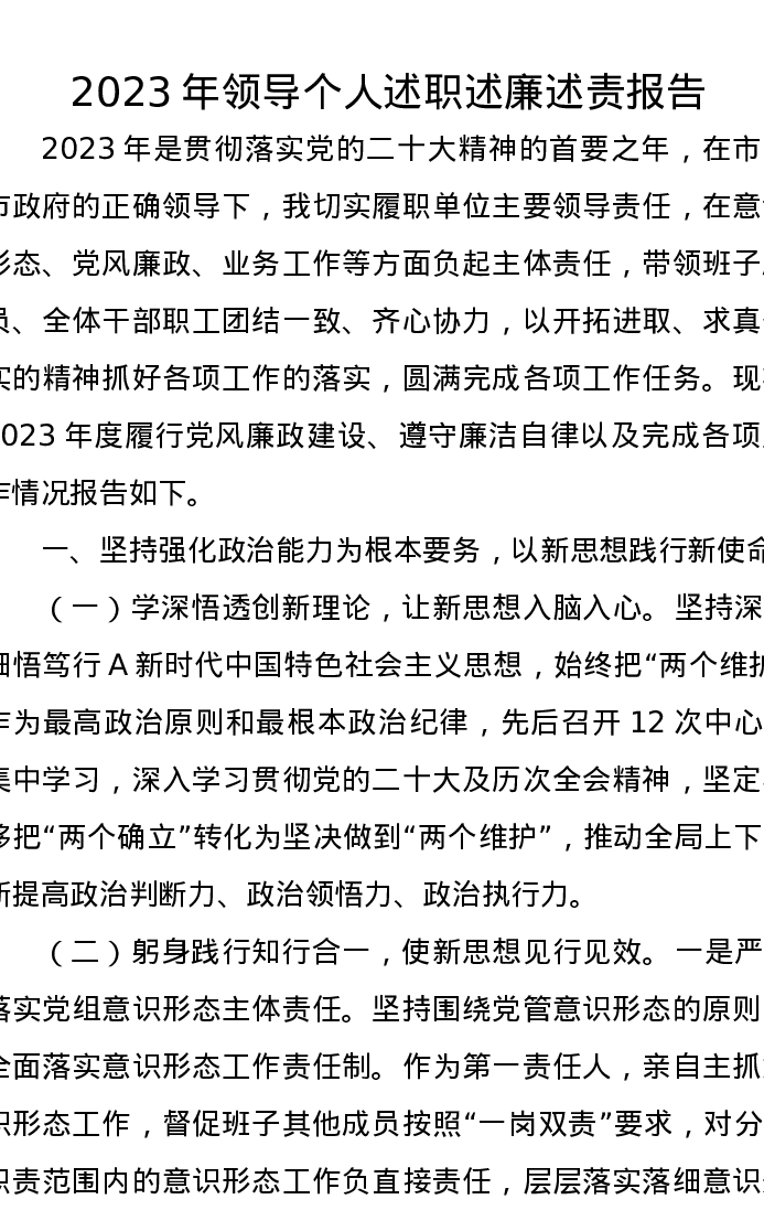 2023年领导个人述职述廉述责报告