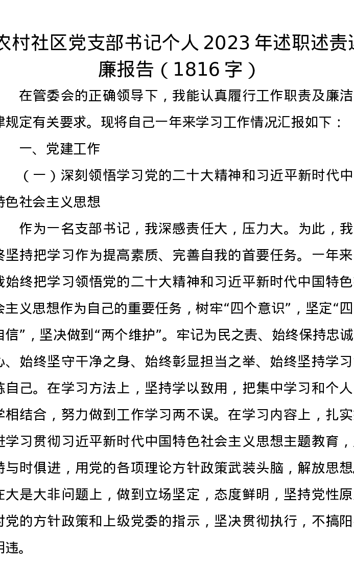农村社区党支部书记个人2023年述职述责述廉报告(1816字)