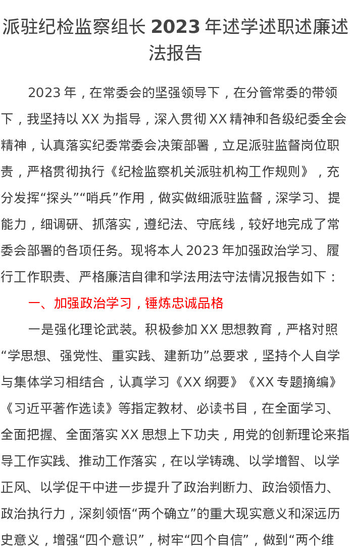 派驻纪检监察组长2023年述学述职述廉述法报告