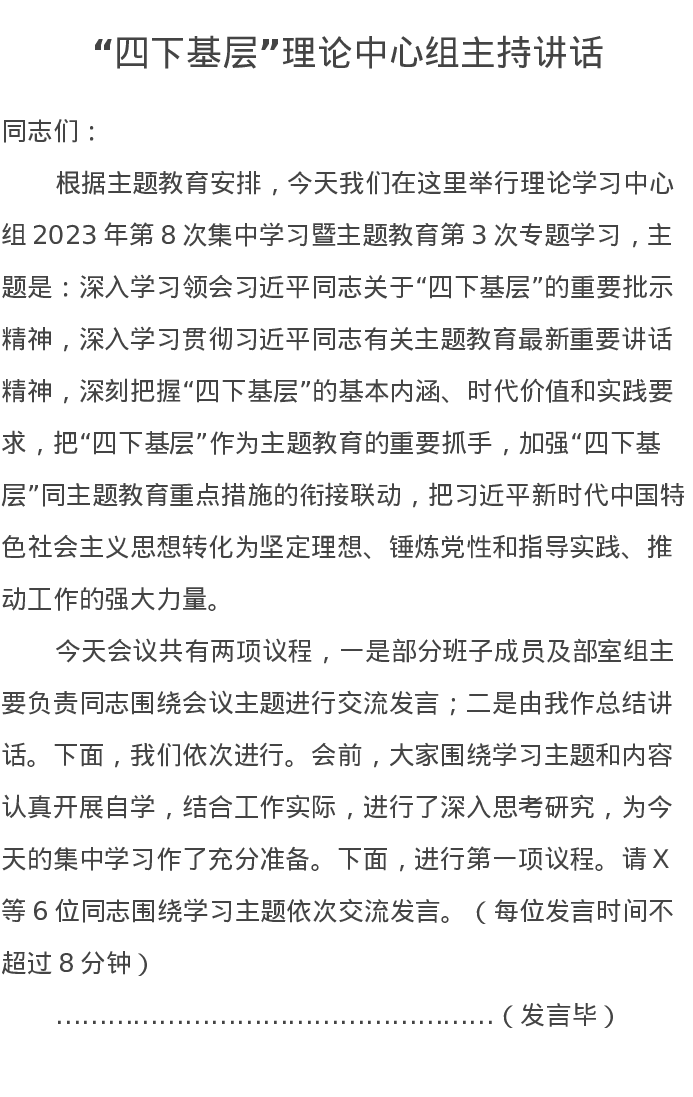 “四下基层”理论中心组主持讲话(特色社会主义思想主题教育)