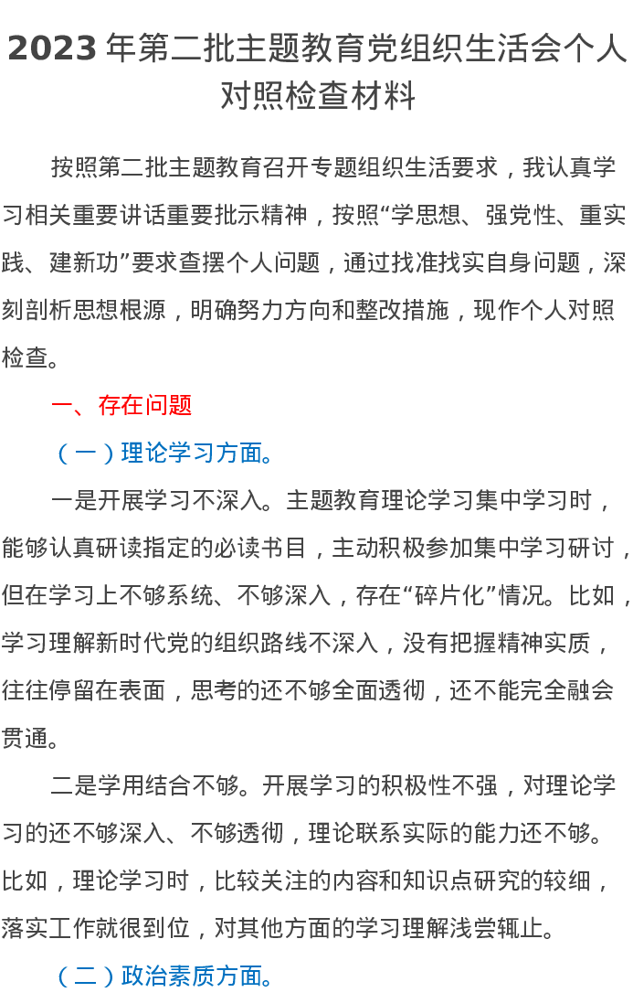 2023年第二批主题教育党组织生活会个人对照检查材料(特色社会主义思想)