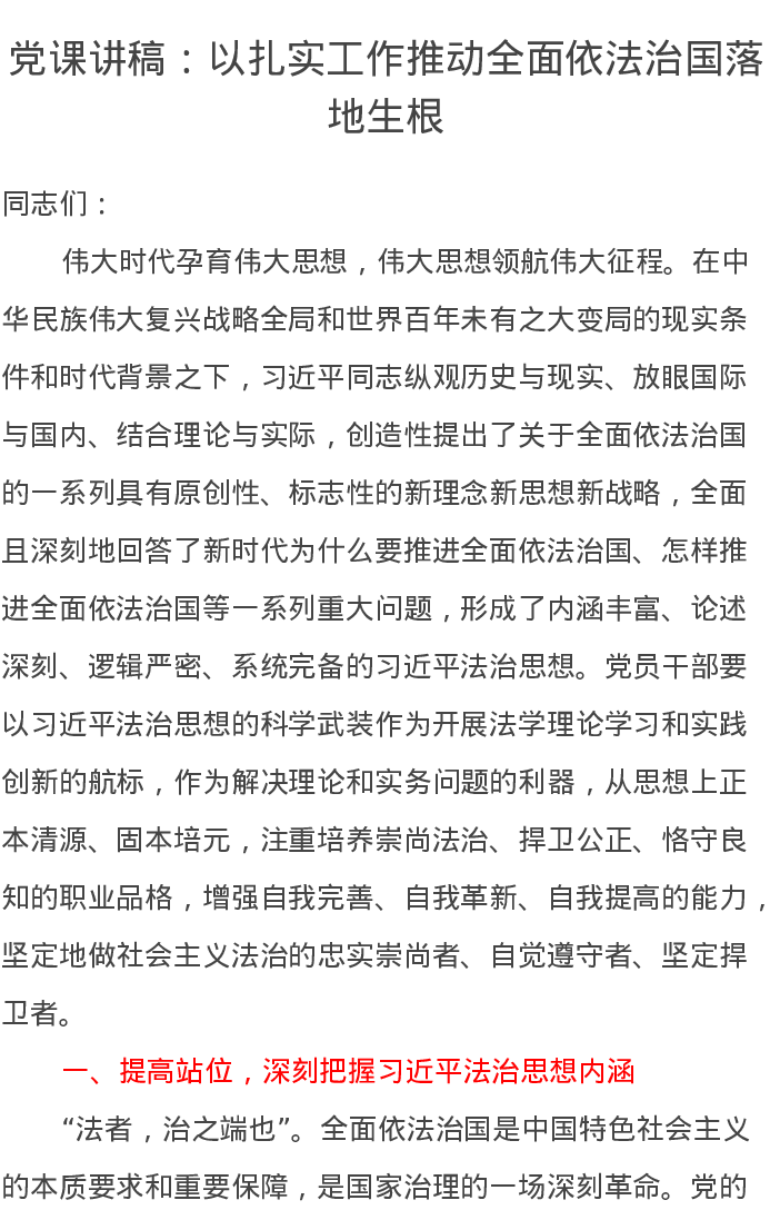 党课讲稿:以扎实工作推动全面依法治国落地生根