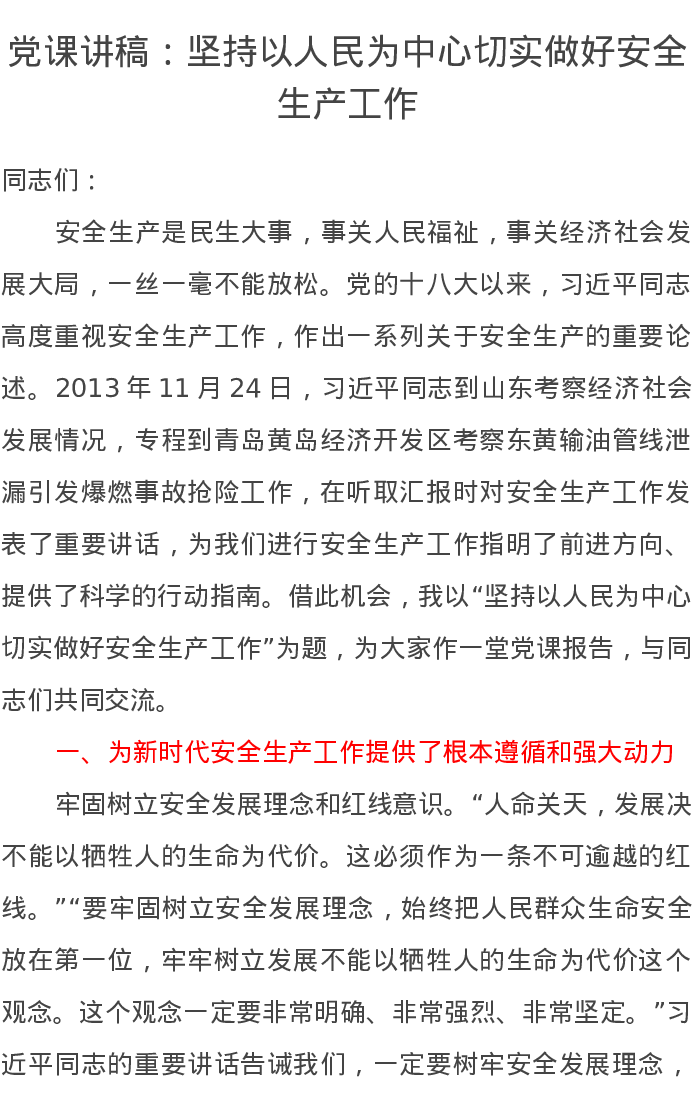 党课讲稿:坚持以人民为中心切实做好安全生产工作