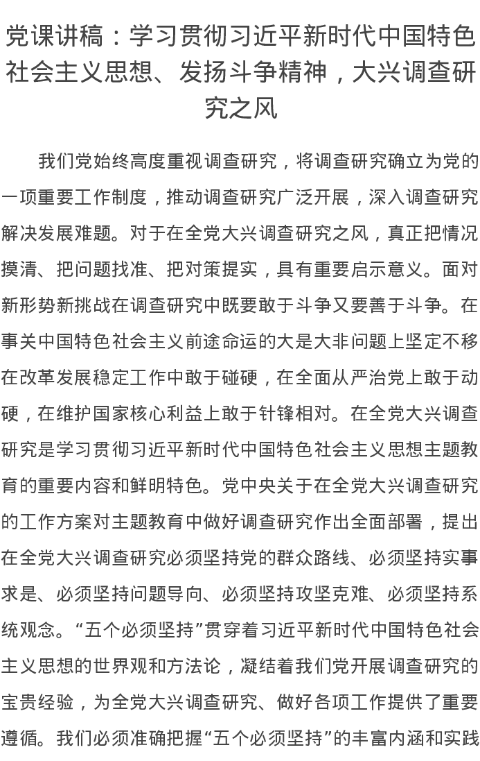 党课讲稿:学习贯彻习近平新时代中国特色社会主义思想、发扬斗争精神,大兴调查研究之风