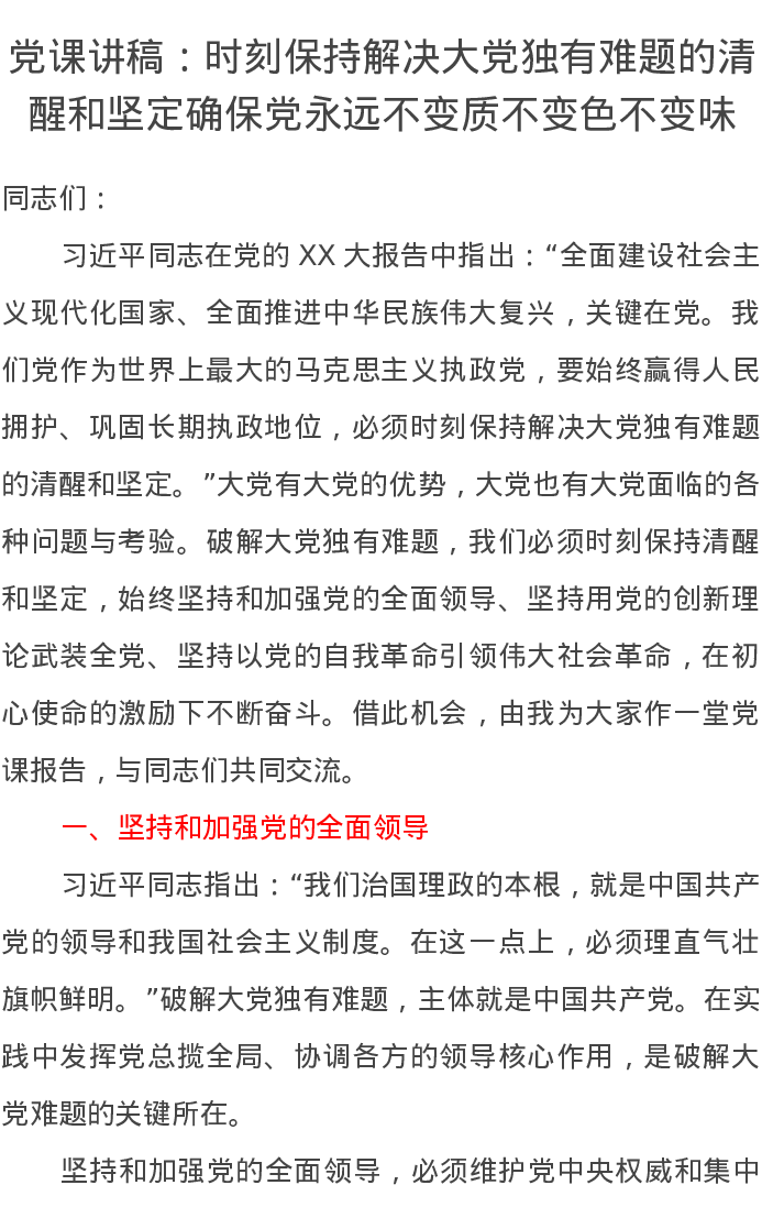 党课讲稿:时刻保持解决大党独有难题的清醒和坚定确保党永远不变质不变色不变味