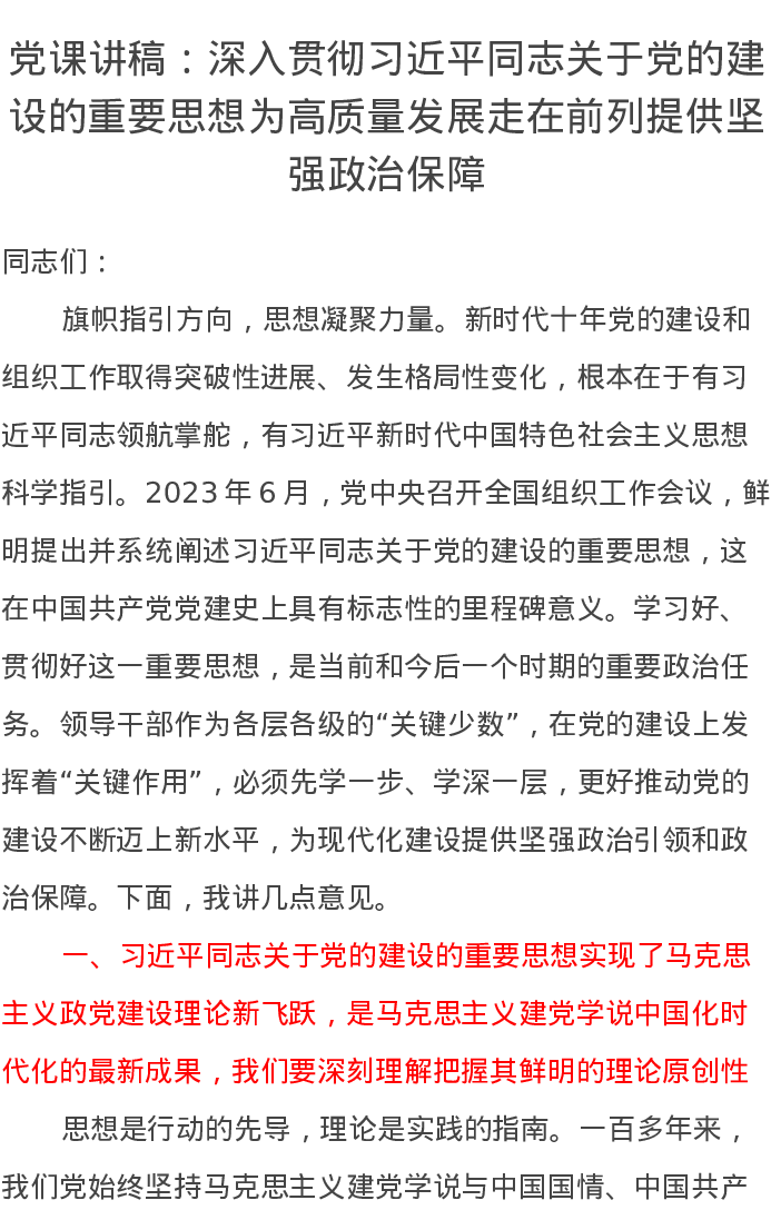 党课讲稿:深入贯彻习近平总书记关于党的建设的重要思想为高质量发展走在前列提供坚强政治保障