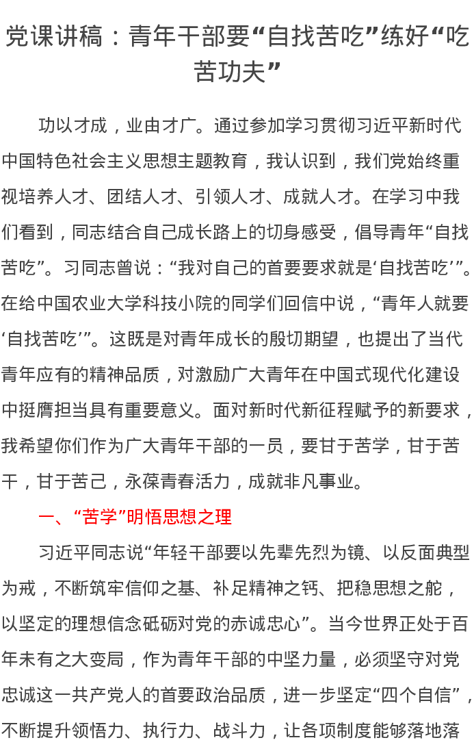 党课讲稿:青年干部要“自找苦吃”练好“吃苦功夫”