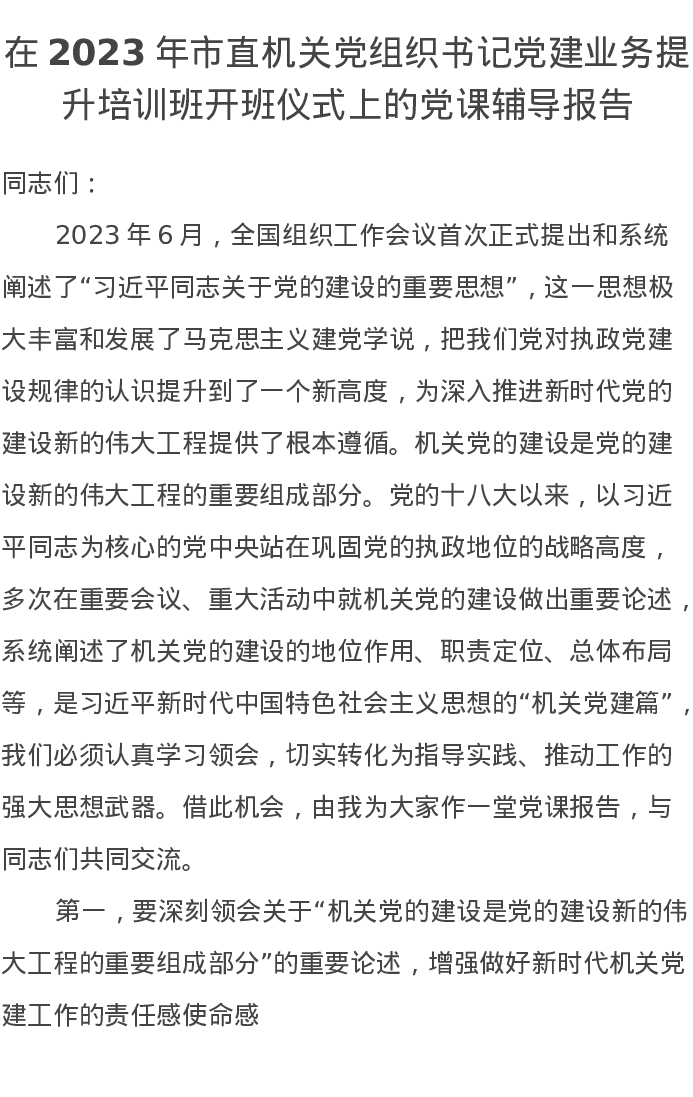 在2023年市直机关党组织书记党建业务提升培训班开班仪式上的党课辅导报告