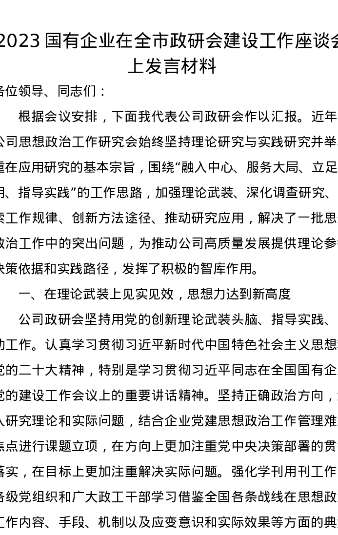 2023国有企业在全市政研会建设工作座谈会上发言材料