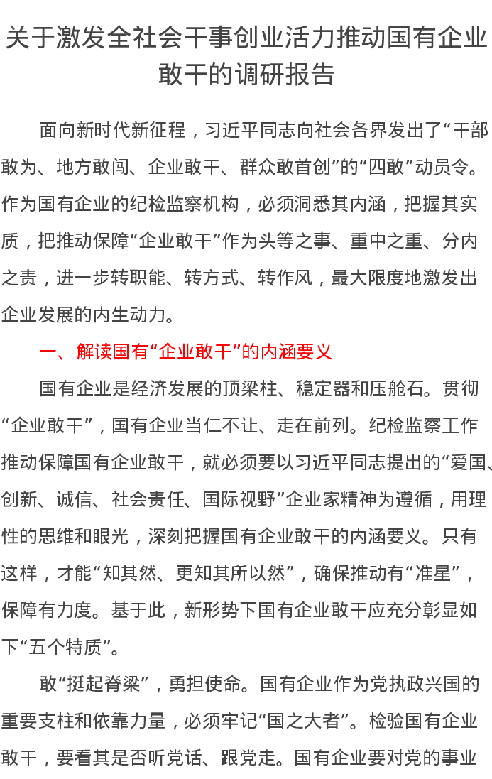 关于激发全社会干事创业活力推动国有企业敢干的调研报告