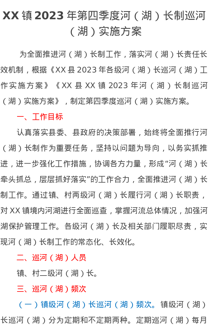XX镇2023年第四季度河(湖)长制巡河(湖)实施方案