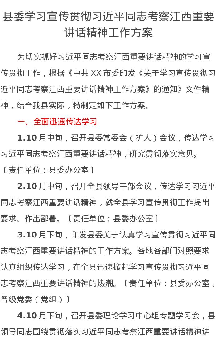 县委学习宣传贯彻习近平总书记考察江西重要讲话精神工作方案