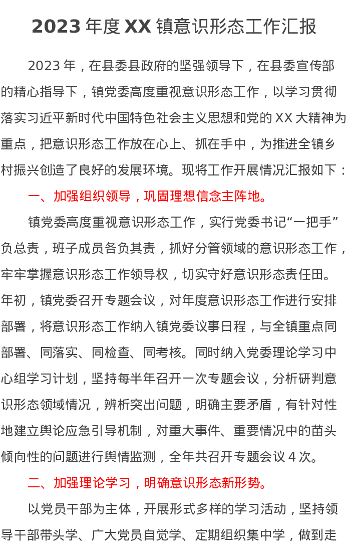 2023年度XX镇意识形态工作汇报