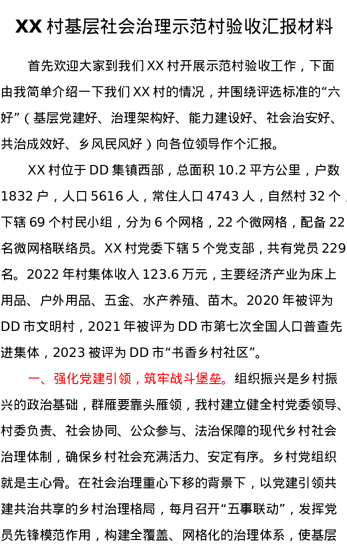 XX村基层社会治理示范村验收汇报材料
