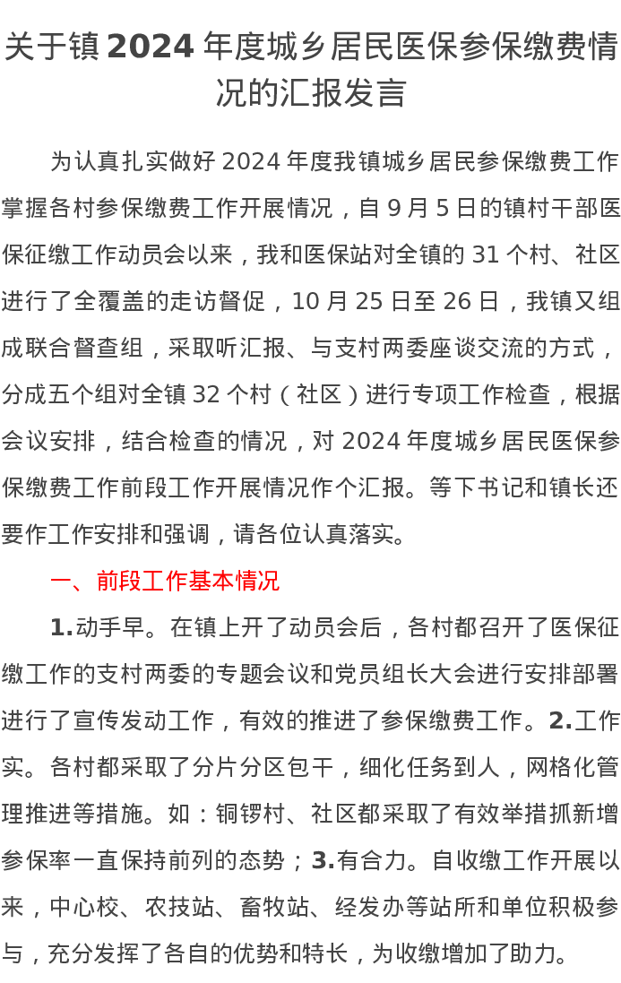 关于镇2024年度城乡居民医保参保缴费情况的汇报发言