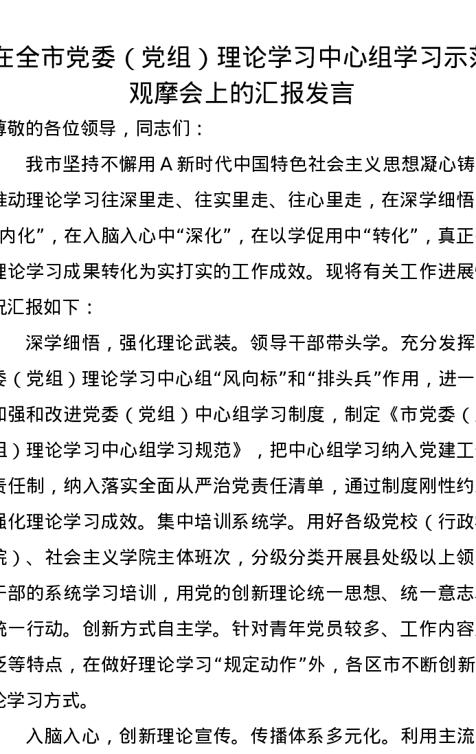 在全市党委(党组)理论学习中心组学习示范观摩会上的汇报发言