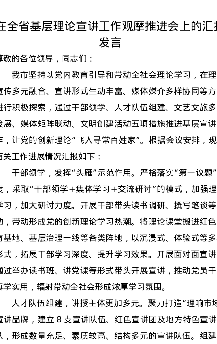 在全省基层理论宣讲工作观摩推进会上的汇报发言