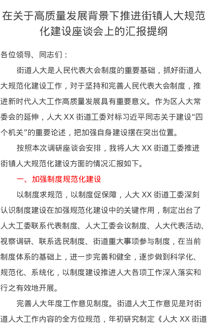 在关于高质量发展背景下推进街镇人大规范化建设座谈会上的汇报提纲