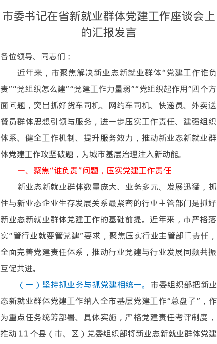 市委书记在省新就业群体党建工作座谈会上的汇报发言