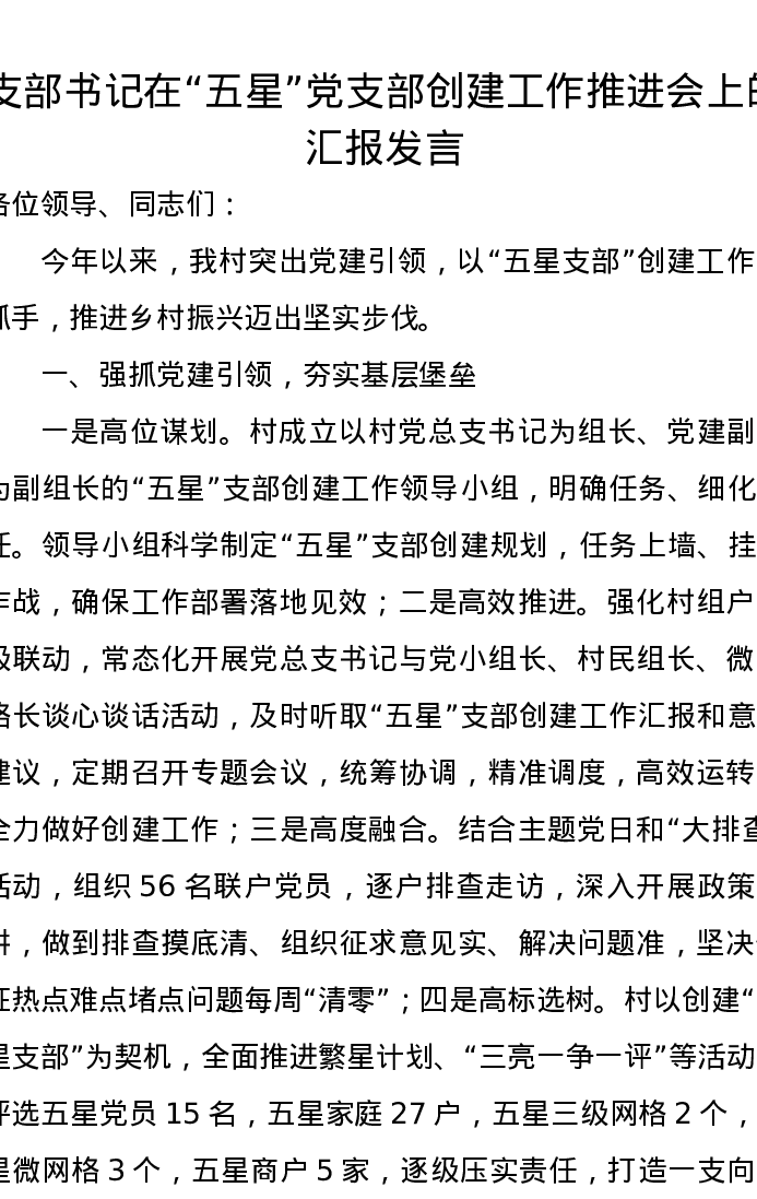 支部书记在“五星”党支部创建工作推进会上的汇报发言