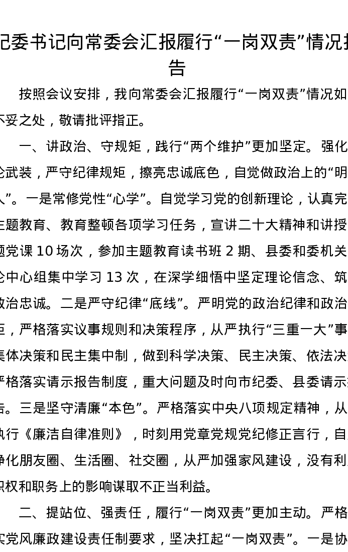 纪委书记向常委会汇报履行“一岗双责”情况报告