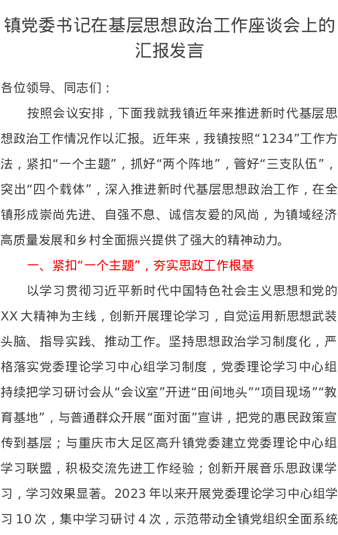 镇党委书记在基层思想政治工作座谈会上的汇报发言