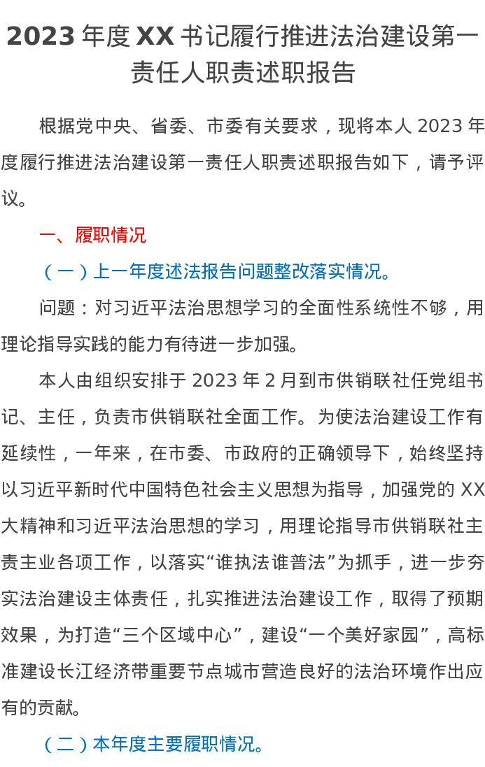 2023年度XX书记履行推进法治建设第一责任人职责述职报告