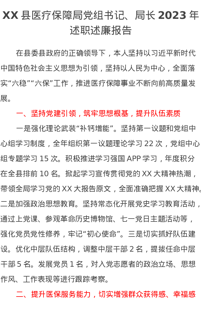 XX县医疗保障局党组书记、局长2023年述职述廉报告