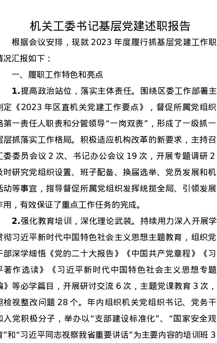 机关工委书记基层党建述职报告