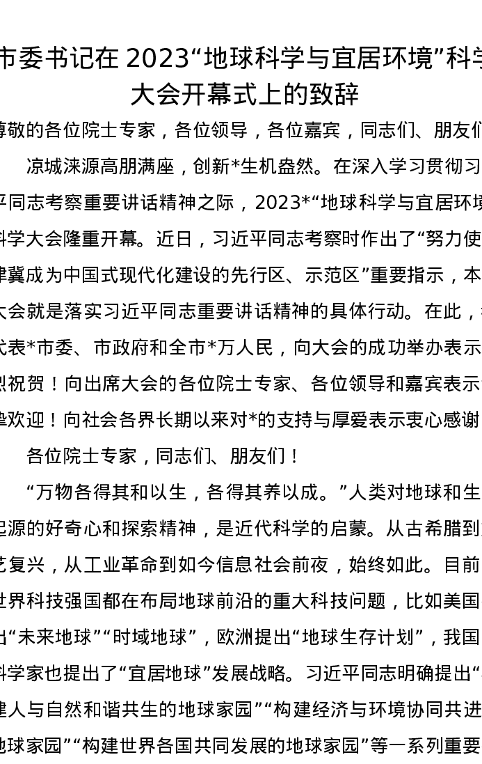 市委书记在2023“地球科学与宜居环境”科学大会开幕式上的致辞