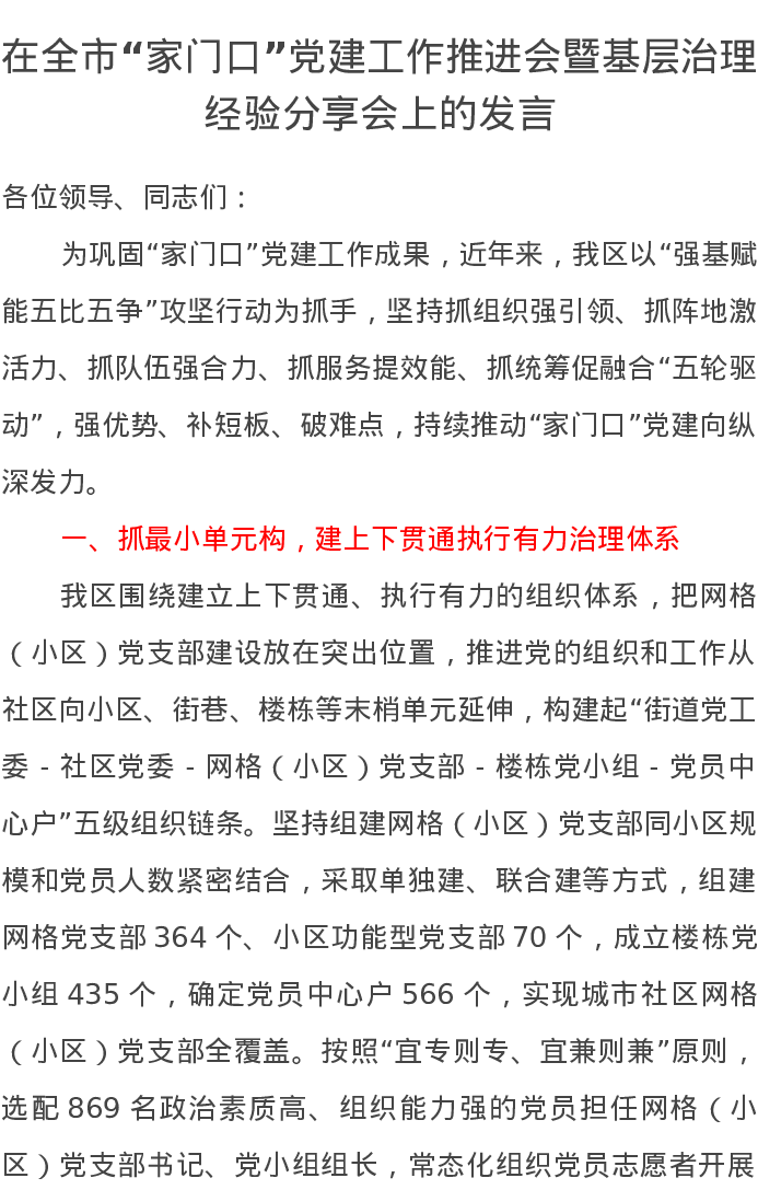 在全市“家门口”党建工作推进会暨基层治理经验分享会上的发言