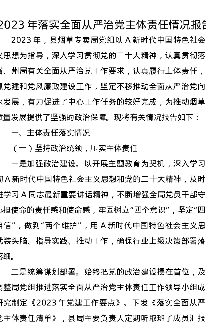 2023年落实全面从严治党主体责任情况报告