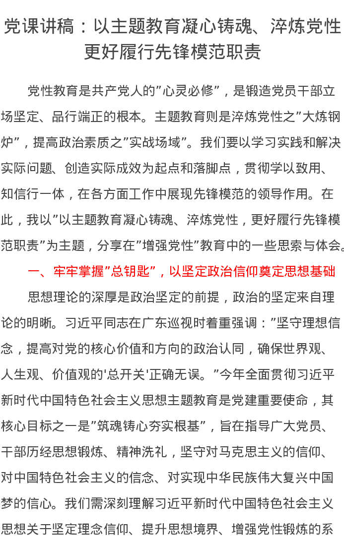 党课讲稿:以主题教育凝心铸魂、淬炼党性,更好履行先锋模范职责(特色社会主义思想)