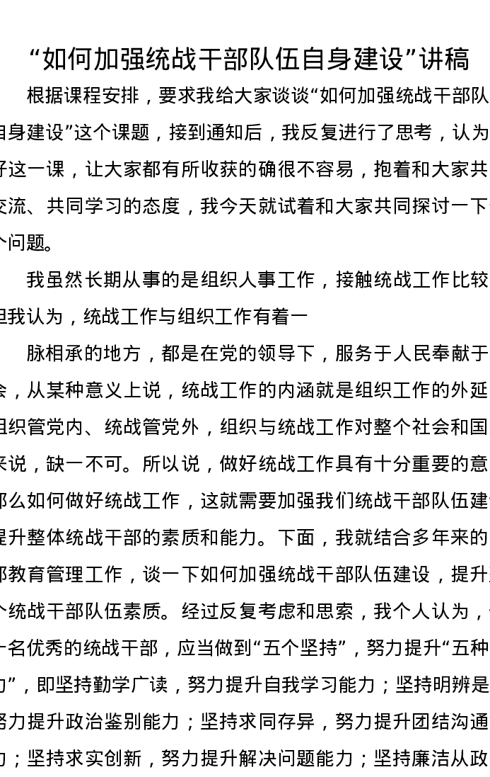 “如何加强统战干部队伍自身建设”讲稿
