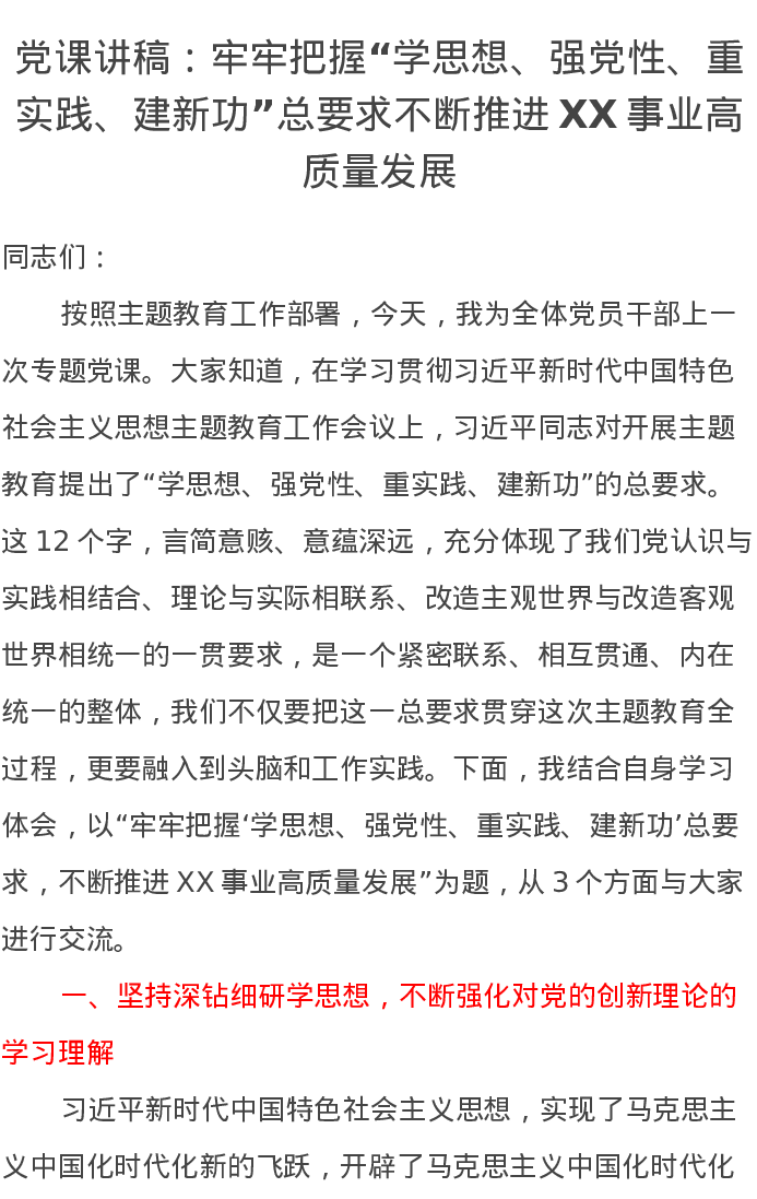党课讲稿:牢牢把握“学思想、强党性、重实践、建新功”总要求不断推进XX事业高质量发展