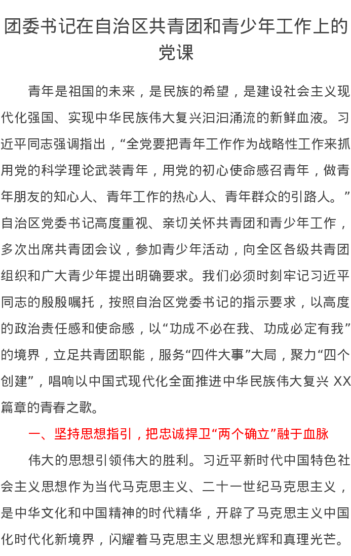 团委书记在自治区共青团和青少年工作上的党课讲稿