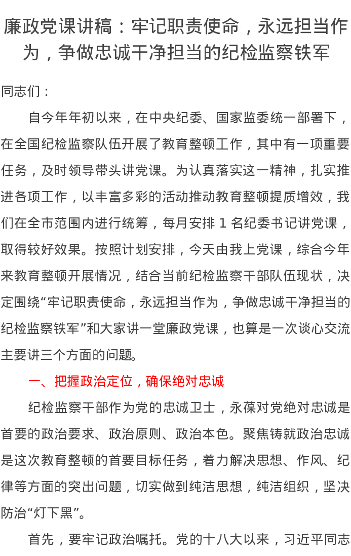 廉政党课讲稿:牢记职责使命,永远担当作为,争做忠诚干净担当的纪检监察铁军