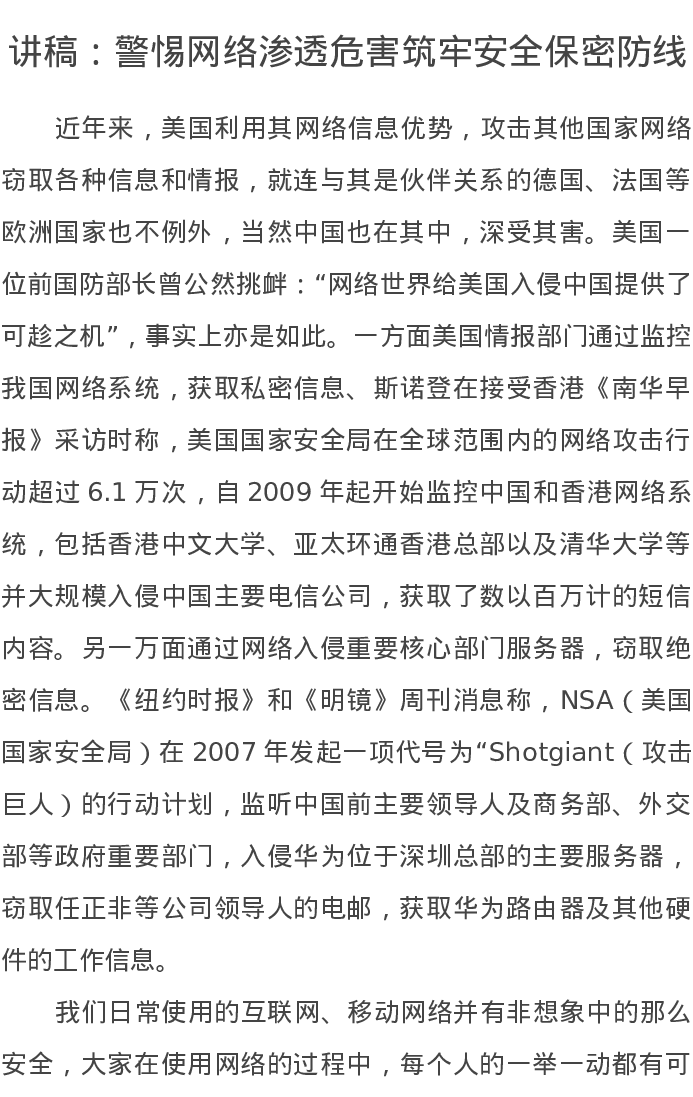 讲稿:警惕网络渗透危害筑牢安全保密防线