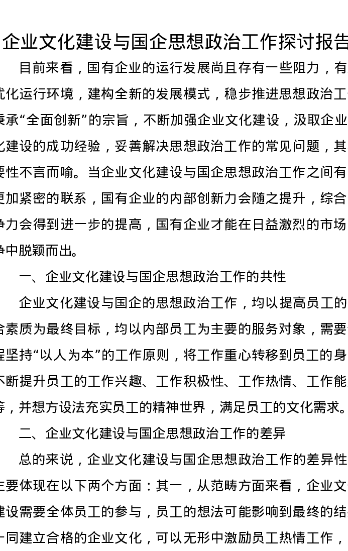 企业文化建设与国企思想政治工作探讨报告