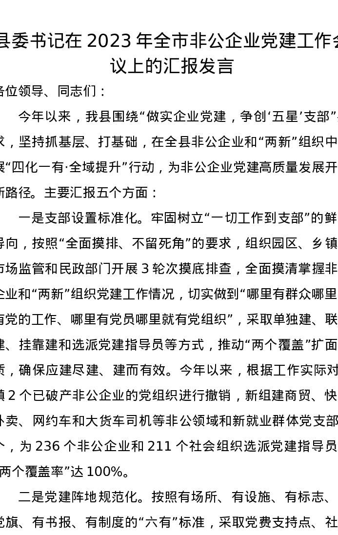 县委书记在2023年全市非公企业党建工作会议上的汇报发言