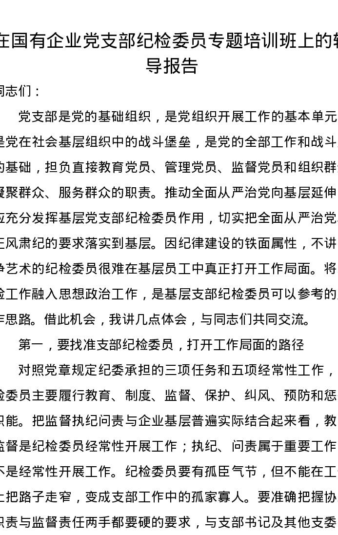 在国有企业党支部纪检委员专题培训班上的辅导报告